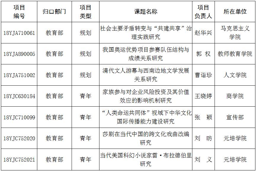 2018年度教育部人文社会科学研究一般项目评审结果已公布,我校7项项目获准立项,项目数比去年增加1项: