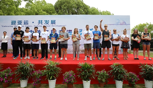 欢迎仪式上,出席领导和嘉宾向14所高校代表赠送书籍。我校学生和国内外高校队开展陆上测功仪、水上龙舟、水上赛艇等互教互学和趣味教学比赛。
