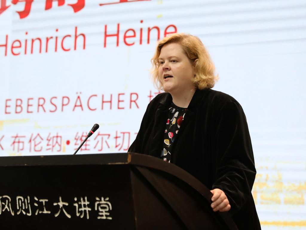 培高德用一口流利的中文向大家讲述了海涅眼中的中国。他用图片的形式展现了海涅作品中提到的中国的陶瓷、中国的丝绸,中国的四书五经、中国语言、文字、历史和中国的地理。