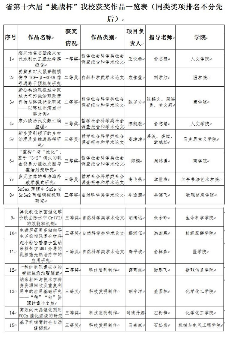 浙江省第十六届“挑战杯”大学生课外学术科技作品竞赛决赛(简称“大挑”)近日在浙江理工大学胜利闭幕。今年“大挑”省赛中,我校推荐25件作品参加,共有15件作品获奖,其中一等奖1项、二等奖2项、三等奖12项,获奖数量为我校近五年之最,我校荣获“最佳进步奖”。