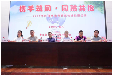 5月31日晚,学校联合绍兴市银行业协会、中国银行绍兴市分行在铁城科教馆一楼报告厅举行了以“携手筑网 同防共治”为主题的2019年防范非法集资宣传进校园活动。绍兴市银行业协会副秘书长甄长超,副校长寿永明,校计划财务处、学工部负责人,中国银行绍兴市分行、中国银行绍兴市越城支行负责人,以及师生代表400余人参加了活动。