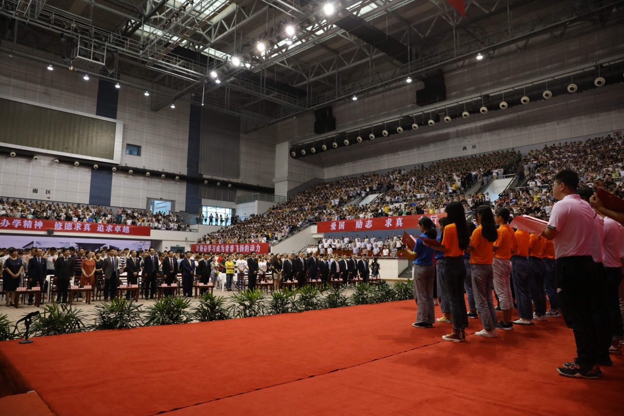 “家国情怀、责任担当;修德求真、追求卓越……”9月2日,在2019级新生开学典礼上,3716名新生以集体宣誓的方式向祖国深情表白,争做一名具有深厚家国情怀、勇于承担时代责任、知行合一敢于创新的新时代青年。在今年的新生始业教育“第一课”中,学校紧扣爱国主义主题,大力弘扬家国情怀,围绕立德树人根本任务,践行“修德求真、追求卓越”的大学精神,激励学生响应习近平总书记的号召,“爱国、励志、求真、力行”,尽情书写无悔的青春。