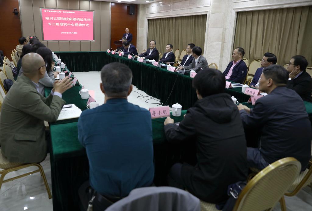 人文社科处处长王华锋主持授牌仪式。我校“新结构经济学长三角研究中心”负责人、商学院院长周鸿勇教授在会上作表态发言。