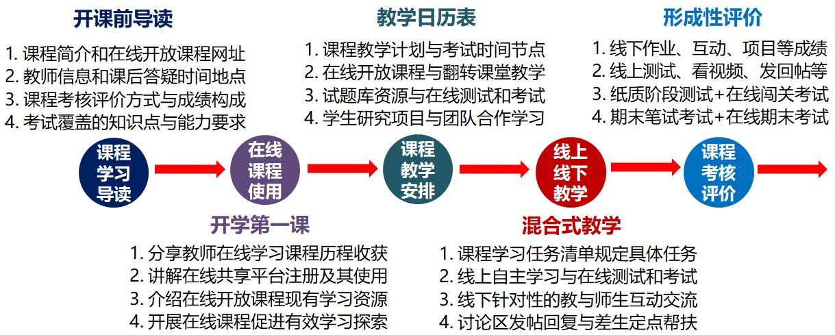 1.课程教学安排。由开课前导读、开学第一课、教学日历表、混合式教学和形成性评价等环节组成。