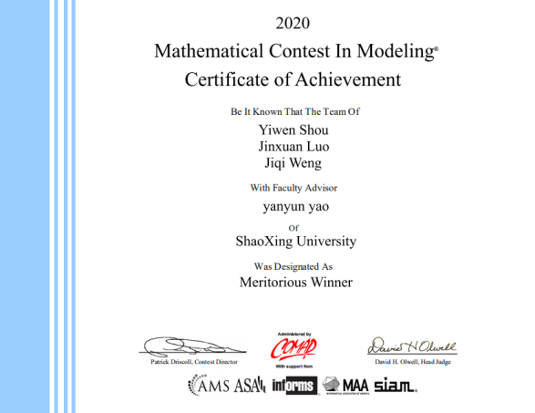 近期,2020年美国大学生数学建模竞赛(MCM/ICM)结果揭晓,绍兴文理学子获得Meritorious Winner奖2项,Honorable Mention奖 3项。这是继我校2019年在该赛事上取得的又一次优异成绩(2019年获得Meritorious Winner奖2项, Honorable Mention奖2项)。