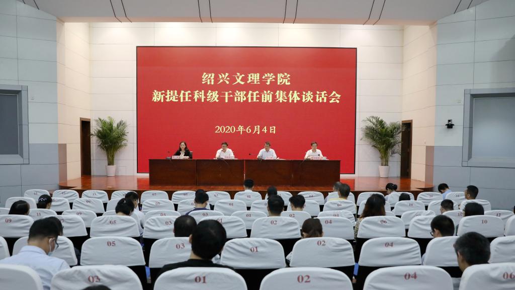 6月4日下午,学校在铁城科教馆报告厅召开新提任科级干部任前集体谈话会,校党委书记汪俊昌,党委副书记沈赤,纪委书记柯羽,校党委委员、党委组织部部长宣绍龙出席会议,党委组织部相关负责人、全体新提任的科级干部和主管参加会议。会议由宣绍龙主持。