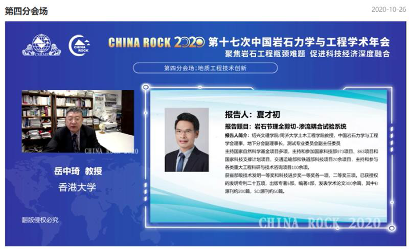 10月26日,China Rock 2020第十七次中国岩石力学与工程学术年会第四分会场的学术报告会议在线上平台成功召开。本次大会是在中国科学技术协会指导下、中国岩石力学与工程学会主办的具有“国际化、规模化、一体化”特点的顶级学术年会。会议主题是聚焦岩石工程瓶颈难题,促进科技经济深度融合。学会所属43个二级机构共组织23个分会场大会共有424场专题学术报告、5场技术培训以及3000平米的科技创新工业展览。