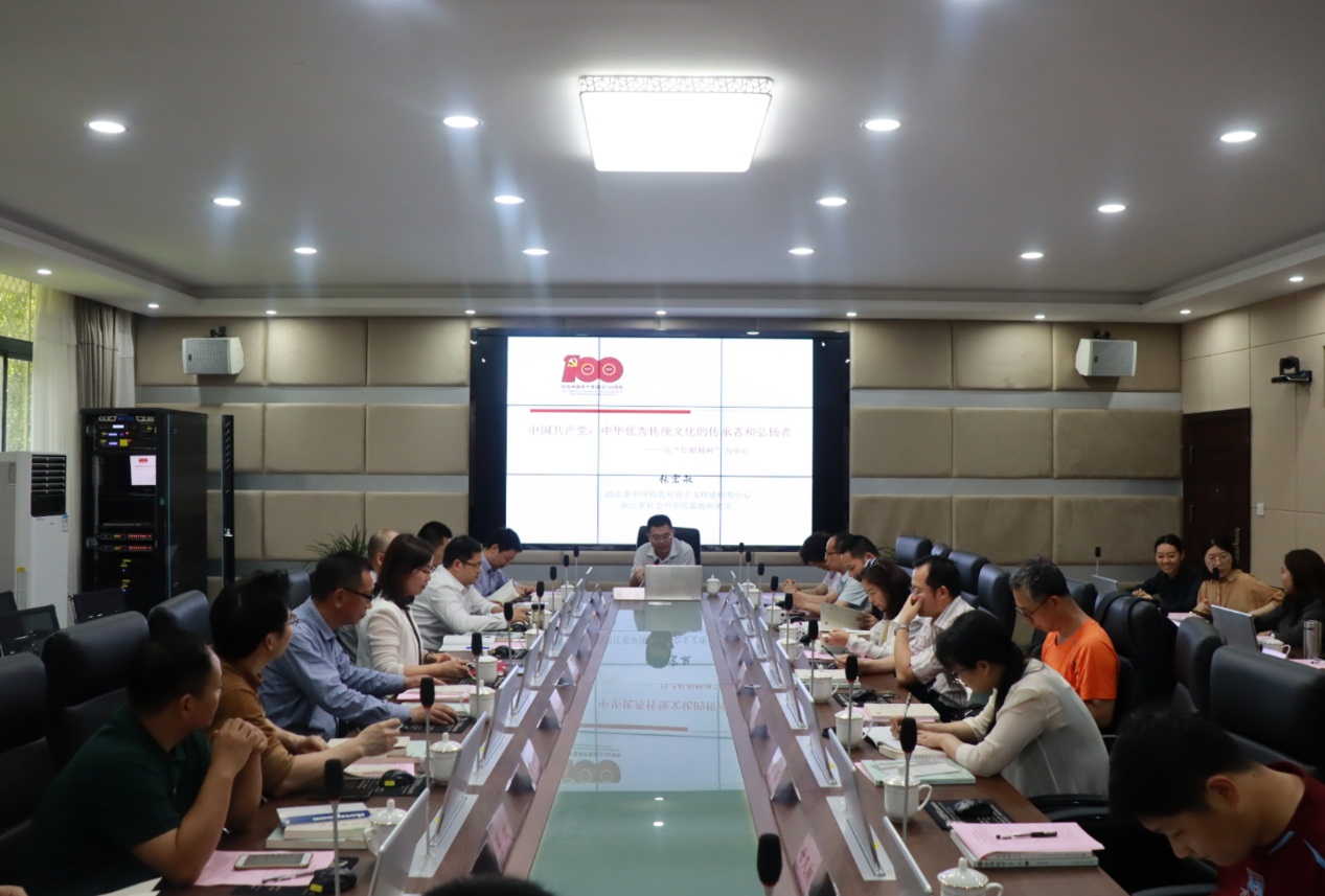 浙江省社会科学院哲学所副所长张宏敏博士作了题为《中国共产党:中华优秀传统文化的忠实传承者和弘扬者》的报告。报告梳理了红船精神的来龙去脉,并以浙江优秀传统文化(“浙学”)中的阳明学、蕺山学、梨洲学为切入点,解读了“红船精神”与中华优秀传统文化中的“知行合一”“万物同体”“慎独慎微”“明德亲民”“以民为本”等思想观念、传统美德和人文精神之间的内在关联,指出中国共产党从成立之日起,既是中国先进文化的积极引领者和践行者,又是中华优秀传统文化的忠实传承者和弘扬者。他指出,从哲学本质上讲,“红船精神”既是一种“文化哲学”,也是一种“精神哲学”,它内在契合于中华优秀传统文化中的“修身哲学”。