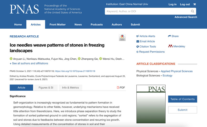 10月1日,国际顶尖学术期刊《美国科学院院报》(PNAS)在线刊登了由我校土木工程学院、浙江省岩石力学与地质灾害重点实验室青年教师李安原和华东师范大学刘权兴教授等中国科学家团队领导,日本、美国和荷兰科研人员共同参与发表的题为《Ice needles weave patterns of stones in freezing landscapes》的最新科研成果(图1)。该研究基于大量室内模型试验,首次提出并验证了驱动分选自组织地貌图案结构形成的新型物理机制——相分离理论。文章一经刊出,受到了人民日报、中国科技报、中国新闻网、科学网、文汇报、新民晚报、新浪、网易、搜狐等诸多主流媒体的关注。
