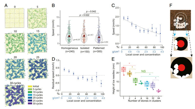 早在60多前,我国地貌学家在第一次青藏科考中就发现过这些美丽的地貌图案,并开展了部分野外监测工作。几乎在同一时间,美国著名地质学家Washburn对此类现象的形成机制进行了总结梳理,并提出了19种可能的物理机制。随后,科研人员对此开展了大量野外监测工作,并发现了由于土壤和碎石导热系数的不同,产生的差异性冻胀是导致此类地貌形成的主要原因。由于野外监测工作多集中在某一现存的地貌结构中,无法还原其形成演变过程。2003年,著名杂志Science以封面论文的形式,报道了Kessler和Werner关于地表斑图形成的统一物理模型,该模型认为不均匀冻胀、空间侧向挤压是导致地表颗粒物质自组织运动的主要机制,并从理论上完美复现了分选地貌的形成、演变和稳定过程。然而由于地表演变过程极其缓慢,该模型缺乏试验证据。