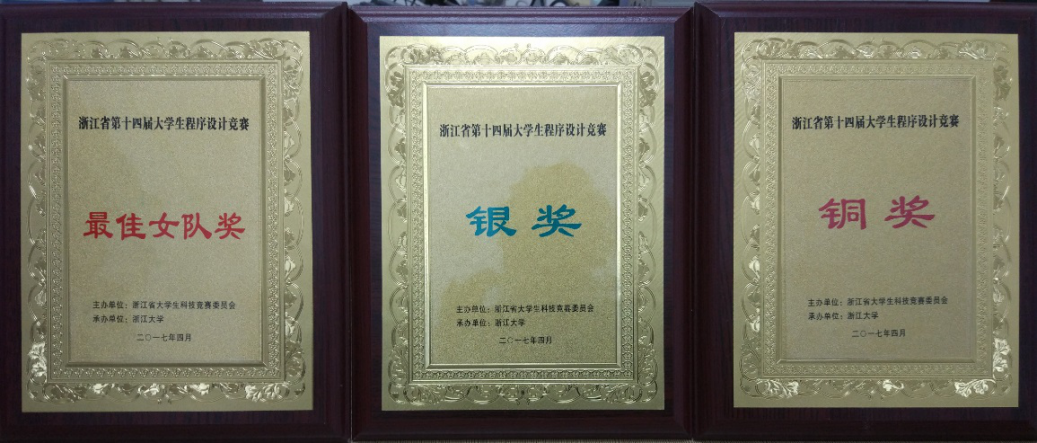 近日,浙江省第十四届大学生程序设计竞赛在浙江大学圆满落下帷幕。本次比赛,我校共派出5支队伍参赛,经过5个小时的封闭式激烈拼搏,最终机电学院计算机131班张碧莲、计算机151班包桉银、计算机152班冷可心组成的“不得了”队(指导教师:黄龙军)排名本科组27位,获得二等奖及最佳女队奖;计算机151班刘泽鹏、冯磊、计算机152班谢思思组成的“开飞机”队(指导教师:黄龙军),排名本科组63位,获得三等奖。