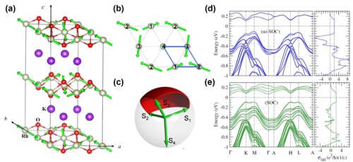 图1. (a) K0.5RhO2的晶体结构元胞,绿色箭头代表Rh离子磁矩;(b) RhO2单层三角晶格;(c) 原胞中4个Rh离子磁矩张成Bloch球面;(d)和(e)为有和无自旋轨道耦合时,体系的能带结构和反常霍尔电导。