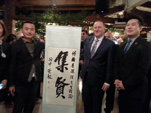 当地时间7月23日晚,新西兰2016总理冬季招待宴会在奥克兰MARKOVING酒庄隆重举行。新西兰绍兴同乡会会长曾险携我校派驻奥克兰大学“兰亭书法学堂”教师苏晓敏出席晚宴,并受到约翰•基总理的亲切接见。