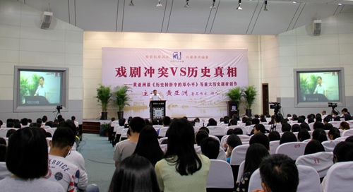 讲座中,黄老师首先与大家分享了他对于《历史转折中的邓小平》这部剧的两个“没想到”:一是没想到这部剧能拍好还能播出来。他表示,该剧题材离当代较近,他曾犹豫这种题材是否适合以电视剧的形式表现出来,之前各有两名著名编剧试图以近代历史为题材写剧拍片,皆不幸夭折。二是没想到收视率竟能破2.0%。他坦言,此前猜测对于近代历史剧,会产生兴趣的只会是老人、教师、机关干部和白领,收视率不会很高,但考虑到中国老年人口数量较多,收视率或可超1.0%。据悉该剧前14集平均收视率竟达2.06%,单集最高达2.37%,80后、90后甚至00后都对该剧抱有浓烈的兴趣。黄老师总结出两个原因:一是他们想了解父辈的生活,二是他们想看看邓小平所创造的世界,“一切历史都是当代史,一切对历史的关注都是对当代史的关注。只有知道以前的道路怎么走,才能知道以后的道路该如何走”。之后,黄老师针对观众的评论发表了看法:“大家对这部剧的评价是毁誉参半,出现这些情况是合理的,也是我们希望看到的。”他认为,一部剧能让这么多人来关注历史,那它就是成功的。对于剧中出现的虚构情节,黄老师也作了详细解释。另外,对于网友因不了解历史而对邓小平产生的误解,黄老师举了恢复高考一例,强调邓小平是个咬着牙关做事的人,并呼吁大家学习邓小平的勇气。