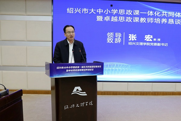 张宏在致辞中指出,“推进大中小学思想政治教育一体化建设”是党的二十大报告提出的重要目标,围绕改革创新,如何提升思政课的针对性和吸引力,要紧扣“培养什么人、怎样培养人、为谁培养人”这个教育的根本问题,深刻理解推进大中小学思政课一体化建设的重要意义。我校联合在绍中小学试点学校和思政课名师工作室,以“越地红色根脉赓续传承、新时代胆剑精神践行弘扬”为主旨,聚焦大思政课程体系建设,通过构建“大、中、小学”协同育人场域机制,着力打造具有绍兴特色的大中小学思政课一体化建设“市域实践”,取得了丰硕成果。下一步,我校将进一步发挥浙江省习近平新时代中国特色社会主义思想研究中心研究基地等省市校“三级平台”作用,整合校内外资源,争取在大中小思想政治教育一体化建设中产出更多成果,贡献更大力量。