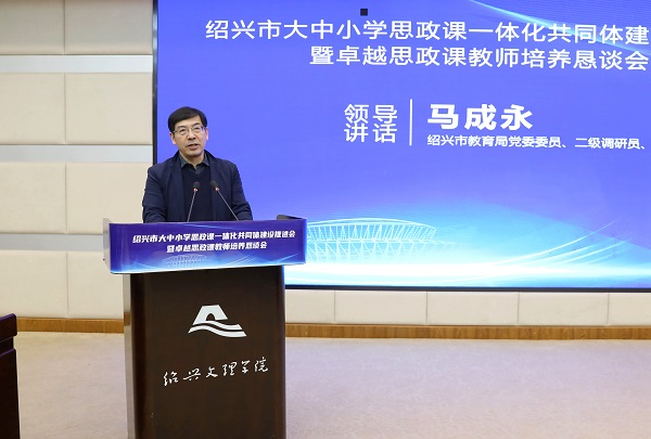 马成永回顾了绍兴市在推进大中小学思政一体化建设的发展历程,对参与思政课体系建设的各位同仁表示衷心的感谢。他指出,举行大中小学思政课一体化共同体建设推进会是一次非常有意义的探索实践,通过组建教育共同体来推动基层学校、名师工作室、业界精英等多元主体协同育人,实现校际协作,打造富有绍兴特色和广泛影响的大中小思政一体化课程体系。同时也提出了三点思考:一是聚焦大思政的课程属性,提升课程共同体的支撑作用;二是聚焦大思政实践理论研究,提升绍兴大中小学思政课工作的教研水平;三是聚焦大思政工作机制健全,提升制度共同体的保障作用。希望绍兴市大中小学一体化共同体建设推进会的举行能做到“五个有”,即思想上有所洗礼、思路上有所嫁接、角色上有所转变、行动上有所借鉴,工作上有所提升,力争在浙江省乃至全国能有更多的绍兴声音、绍兴元素、绍兴故事、绍兴样板。
