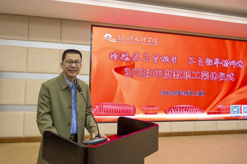 崔凤军代表全校师生向辛勤付出的荣休教职工致以崇高的敬意和衷心的感谢。他指出,绍兴和我校历来有崇师重教的传统和优势,通过荣休仪式等活动,旨在引导全校教职工牢记教书育人初心使命,传递教师职业荣誉感和自豪感,打造有温度的育人氛围。荣休的各位教师饱含对教育事业的热情和执着,为全体文理人做出榜样,也生动诠释了习近平总书记提出的“教育家精神”。他表示,学校将一如既往地弘扬尊老爱老的传统,更加用心地服务,对荣休教师思想上关心,生活上照顾,祝愿各位老师身心健康,福满四季。