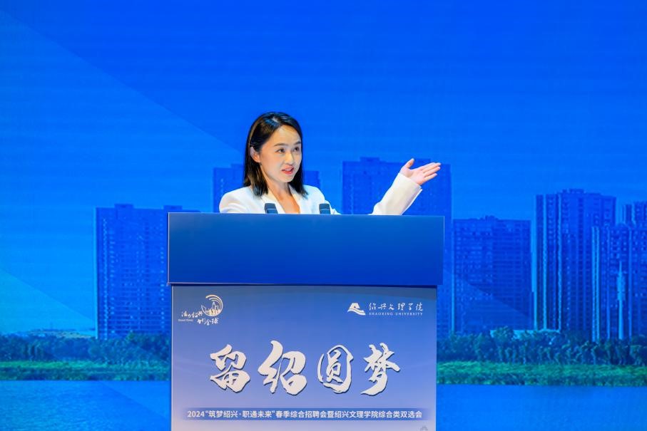 我校优秀校友、留绍代表——绍兴三花新能源汽车部件有限公司人力资源部高级经理王平分享在校学习和就业的经历;上虞区人社局副局长钱晓婧介绍了实践基地建设背景和支持举措;市人社局人才专员周欣向参会学生进行绍兴城市及人才政策宣讲;浙江新和成股份有限公司HR金仲杰、浙江七色彩虹控股集团有限公司人力资源部经理张银萍作现场推介。