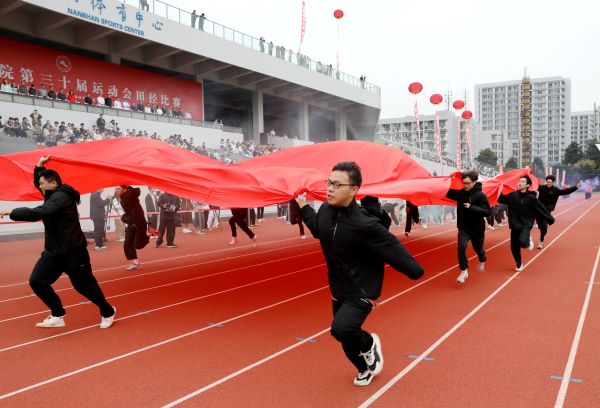 10月25日上午,校第三十届田径运动会在南山田径场开幕。校长赵阳,校党委副书记张宏,副校长柳国庆、陈均土、赵浪平、胡云进,校党委委员梁瑜、黄曼,以及校运动会组委会全体成员在主席台就坐。开幕式由柳国庆主持。