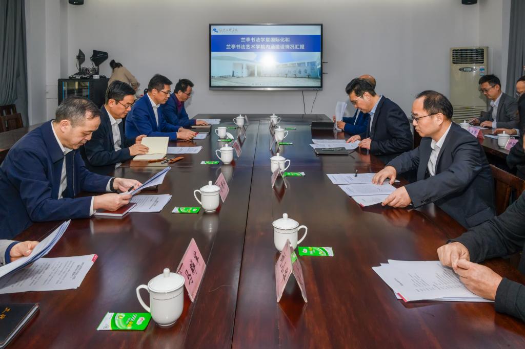 崔凤军汇报了兰亭书法艺术学院基本情况,并从标准化教具、数字课堂、空中指导、双语师资、办学类型等方面介绍了海外“兰亭书法学堂”建设情况。兰亭书法艺术学院是由省级人民政府批复建立的全国首个书法学本科专业布点招生和国内唯一独立校区办学的书法学院,2004年7月开始以美术专业书法方向首次招生以来,累计为社会培养输送书法专业人才1044人。海外“兰亭书法学堂”迄今已在10个国家建立11个学堂,获评2021年度浙江省宣传思想文化工作创新项目。崔凤军指出,接下来,学校将围绕建设有特色、重质量、开放型学院目标,持续推进兰亭书法艺术学院标准化、国际化、社会化建设,高质量推进兰亭书法艺术学院特色发展、创新发展,拓展高层次书法人才培养链,优化书法教育教学模式,建成兰亭书法体验馆、兰亭书法文科实验室、兰亭书法研学实验室,并从2025、2030年两个阶段建设高端的书法文化国际传播阵地,努力提升在服务全国和省市书法文化事业发展中的贡献度和美誉度,更好担负起新的文化使命,为推动中华优秀传统文化创造性转化、创新性发展作出新的贡献。