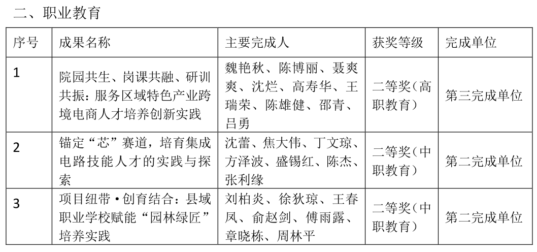 据悉,浙江省教学成果奖每四年评选一次,是全省教育教学领域的最高奖项,代表省内教学改革与建设的最高水平。近年来,学校秉持“修德求真”校训,全面落实立德树人根本任务,系统推进教育教学改革,人才培养特色多次获省级以上媒体报道。学校高度重视教学成果培育工作,学校主要领导研究部署,教务处出台教学成果奖项目培育管理办法,不定期邀请省内外专家来校指导等,教学改革项目结出累累硕果。学校将以此次获奖为契机,将成果纳入学校“十五五”教学改革推广计划,在更多专业和课程中推广应用,持续提升学校教育教学水平,推动学校人才培养质量再上新台阶。