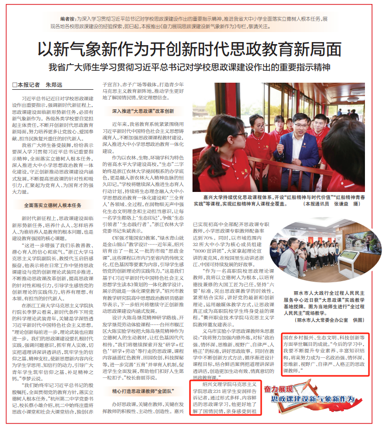 浙江教育报5月14日:以新气象新作为开创新时代思政教育新局面 我省广大师生学习贯彻习近平总书记对学校思政课建设作出的重要指示精神