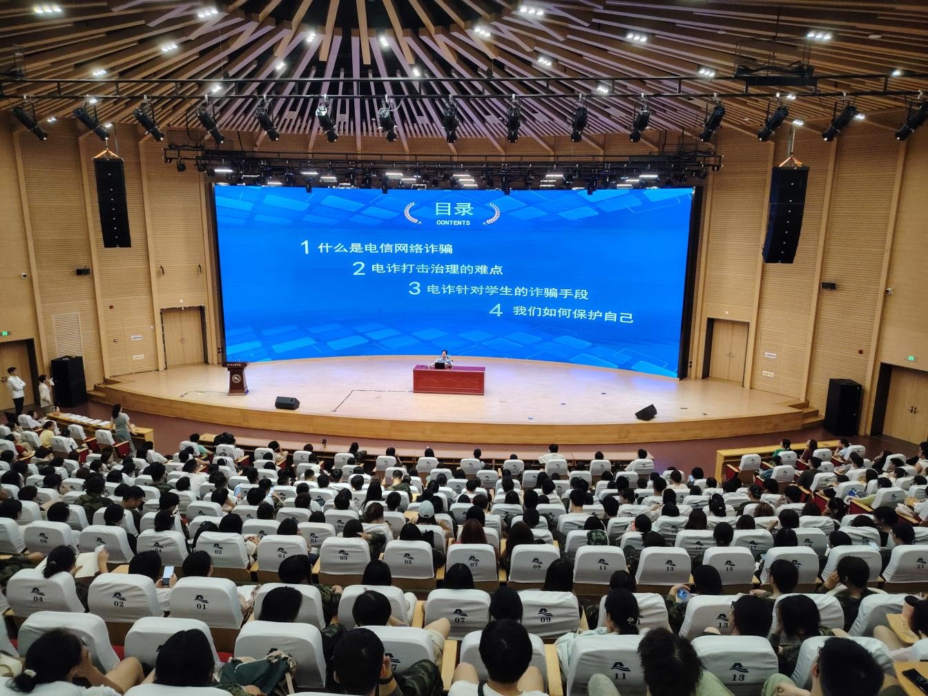 为增强2025级新生的反诈意识和识骗能力,筑牢校园安全防线,近日,学校依托校警驿站,联合市公安局越城分局反诈中心,面向全体新生开展“开学第一课”反诈宣讲系列活动。市公安局越城分局杨健哲副局长及反诈中心13位民警,为近5100名新生带来了一场生动而深刻的安全教育。