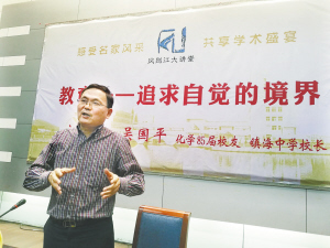 听说吴国平要来绍兴举办讲座,昨天下午,文理学院校门口停满了车。下午3点半举行报告,半小时前,报告厅里就座无虚席。吴国平是宁波人,1983年考入绍兴师专化学系,10多年前开始担任镇海中学校长。