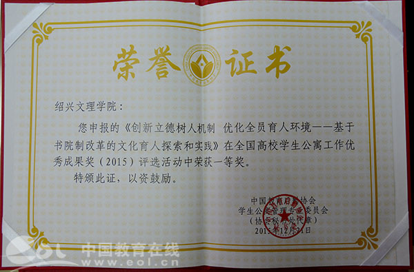 与此同时,通过优化“相约星期三”“诚信驿站”“阳明讲堂”“义务宣讲员”等品牌项目,借助书院学生公寓平台,搭建密切师生联系、加强学生自主管理的桥梁。2012年,学校成功承办浙江省高校寝室卫生管理和文明建设工作现场会;2015年,学校进入深化书院制建设的重要阶段,10月召开全校深化书院制改革推进会,进一步统一全校师生的思想,明确改革发展的方向,坚定深化建设的步伐,扎实推进书院制建设进程,积极营造良好的全员育人环境氛围。