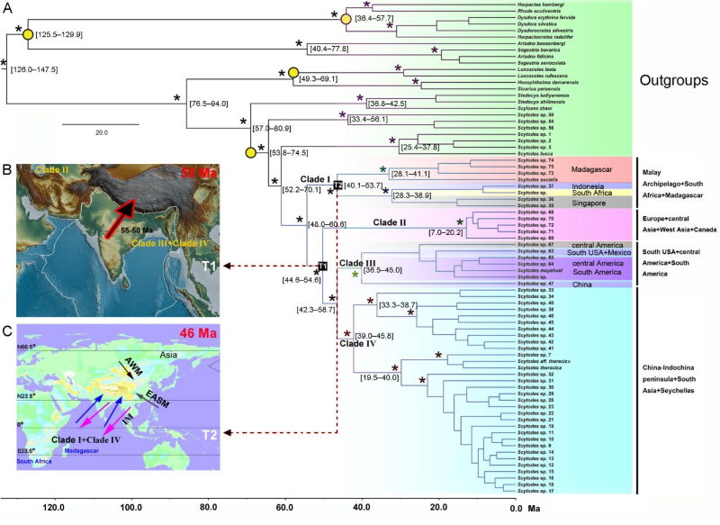 唾蛛(图1)也叫喷液蛛,属于蜘蛛目花皮蛛科。唾蛛有大型毒腺,捕捉猎物时先向猎物喷射一注可瞬间凝固的粘性物质,将猎物钉在地上,再用蛛丝绑住后将其吃掉。亚洲季风自热带印度大陆延伸到温带东亚,是地球上独特的、强大的径向大气环流系统。科学界猜测印度季风带来的水汽通道影响了生物多样性形成,那么季风是如何影响唾蛛分布的呢?论文基于23年世界范围内花皮蛛(唾蛛)样本(84种),根据6个基因序列数据的谱系地理分析发现:1)胸纹花皮蛛种组在大约46.5–33.0百万年前,从东南亚/南亚地区向东非/南非扩散,且在晚中新世时期次数明显增多;2)扩散事件发生时间暗示,印度季风驱动胸纹花皮蛛种组从亚洲到非洲间的区系交换;3)该类蜘蛛的扩散模式暗示,从始新世中期开始,当印度季风从南北方向转向东西方向时,胸纹花皮蛛种组的扩散方向也发生了相应地转变(图2和图3)。该工作得到国家自然科学基金(32170463,31860602,31660611,31460554)支持,(文章链接:https://doi.org/10.1111/gcb.17596)。