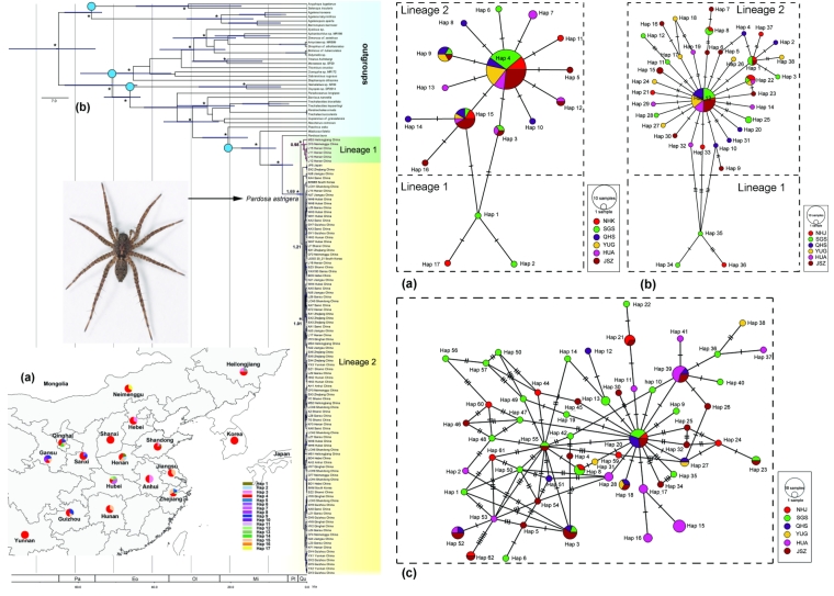 图4.全部豹蛛的谱系地理格局及扩散历史