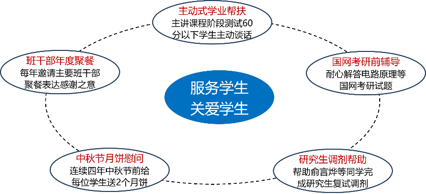 班主任工作始终以服务学生、关爱学生为宗旨,保持亲和力,努力亲近学生,成为学生的贴心人。主动为学生提供《电路原理》等专业课程的学业帮扶,邀请自己主讲课程期中考试60分以下学生进行个别谈心、帮助寻找原因;耐心解答学生在国家电网考试和研究生考试中遇到的电路原理课程试题;千方百计做好学生的考研调剂工作,成功帮助俞言烨同学调剂到湖州师范学院控制科学与工程学科的研究生;每当中秋佳节来临之际,送给班上每位同学两个月饼,让他们品尝到节日的气息,连续保持了四年。