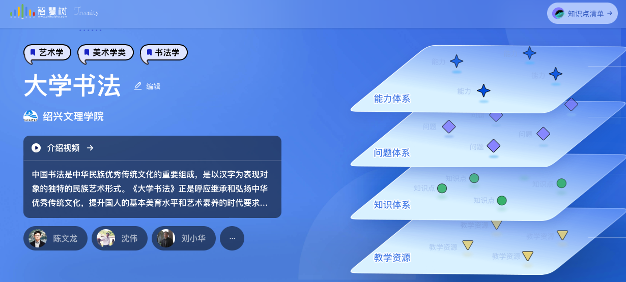 《大学书法》课程知识图谱新形态AI课程上线是对智慧教育理念的积极响应,在建设知识图谱基础上,开展问题图谱和能力图谱建设,以全面搭建本课程全框架的“四维知识体系”,为学生学习提供系统化的知识结构,全面提升学习质量,实现个性化精准学习。