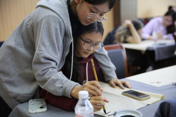 体验课上,兰亭书法艺术学院教师丁诗薇为学生团讲述我国书法的历史及基本概况,帮助他们对中国书法艺术有了更加清晰深刻的认识。学生们纷纷亲身体验书写,师生在旁进行辅导,更加切实感受书法艺术魅力。