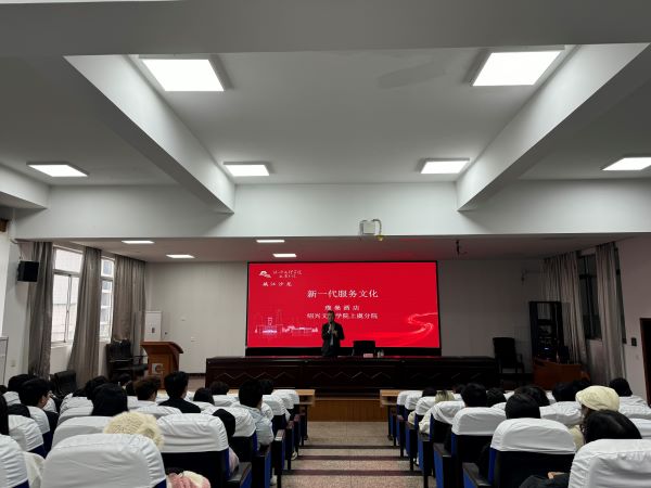 为探讨“新一代服务文化”在酒店管理与服务教育中的应用,上虞分院特邀秦森(绍兴)文旅发展有限公司璞燊酒店房务总监李颖东在行知楼大报告厅作“新一代服务文化”主题报告。人文与管理系主任罗智颖、党支部书记陈辉、教师代表及大一大二全体学生参与讲座。