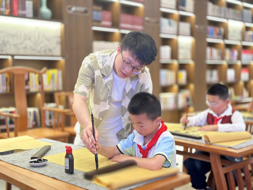 在明善书院,兰亭书法艺术学院研究生代表耐心讲解汉字的间架结构、运笔技巧及书写注意事项,引导小朋友们体验汉字书写的乐趣。刘小华与两位研究生则针对同学们书写时的握笔姿势、笔画顺序等问题进行手把手指导,并提笔示范,从起笔、行笔到收笔,每一个动作都细致入微。孩子们热情高涨,大胆执笔挥毫,在笔墨流转中感受中华汉字的独特魅力和中华文化的博大精深。
